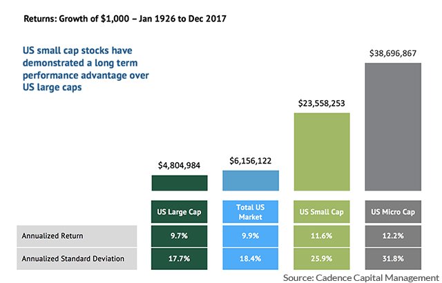 Over the very long term, small-cap and micro-cap U.S. stocks have significantly outperformed shares of larger companies