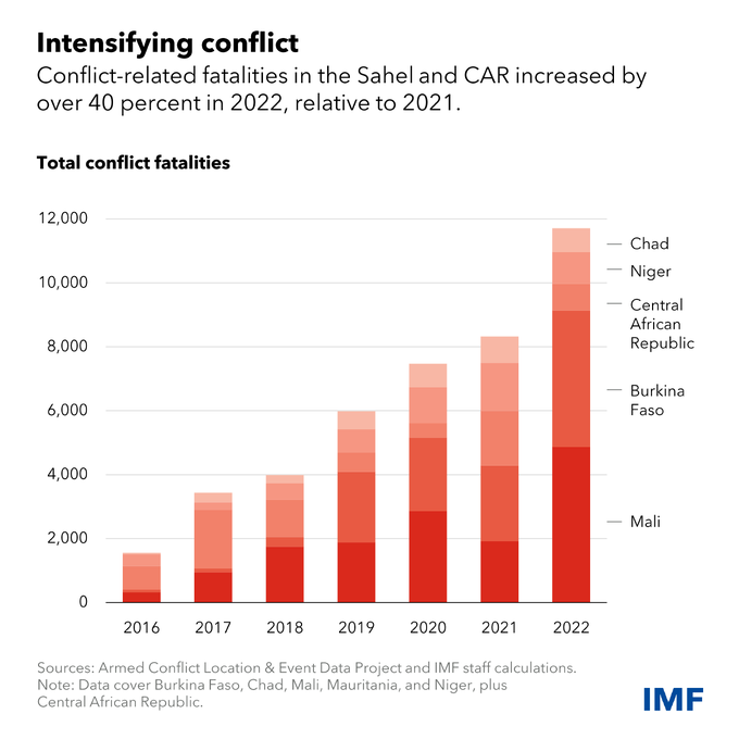 IMF: In 2022, the number of conflict-related fatalities in countries in the Sahel and the Central African Republic increased by more than 40%. Our Country Focus explains why military takeovers and other shocks are compounding obstacles to economic development.
