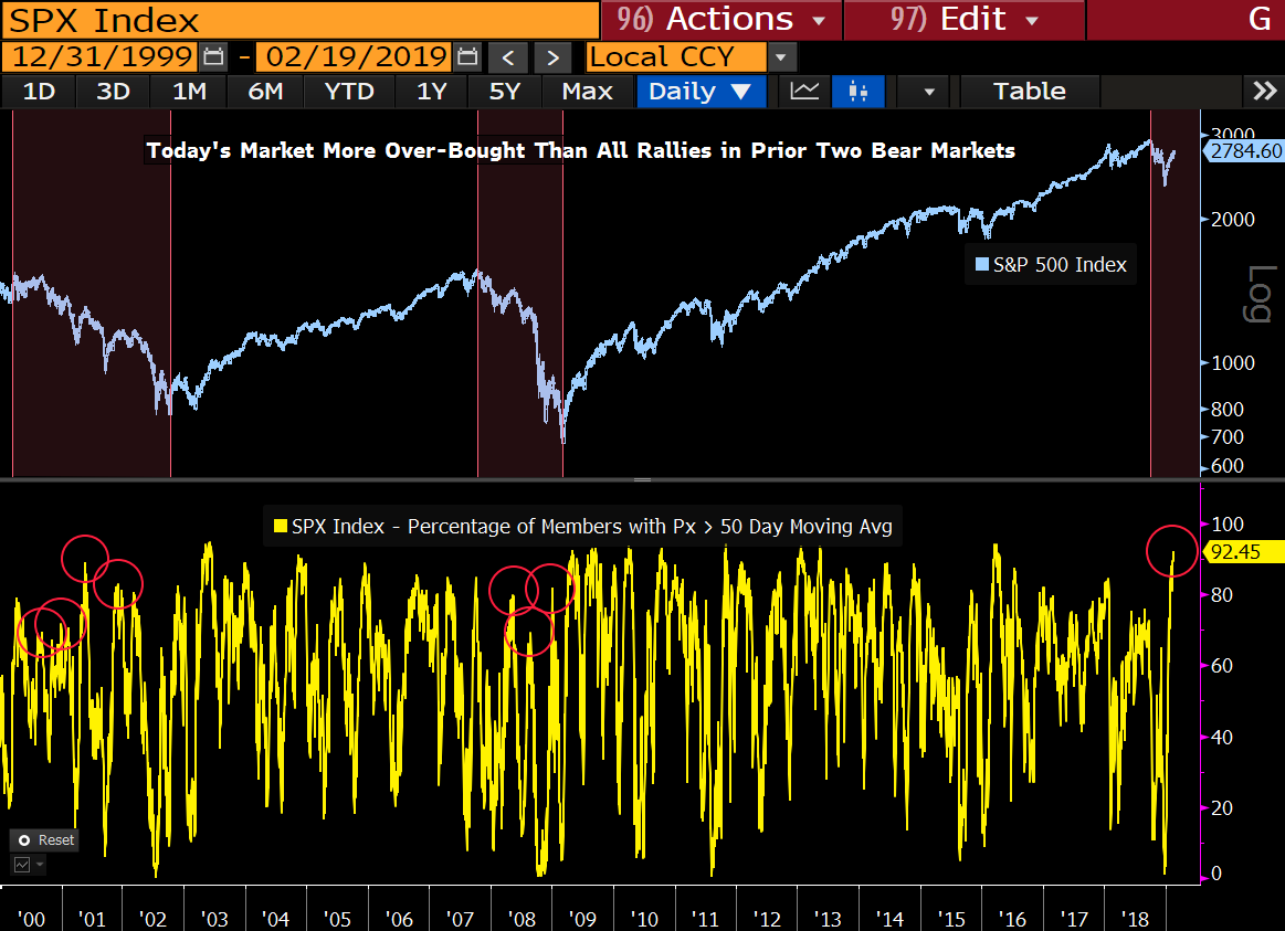 The S&P 500 is more over-bought today than after all rallies in the prior two bear markets based on the percent of stocks above the 50 DMA. Great setup for selling if one believes this is only the beginning of a bear market