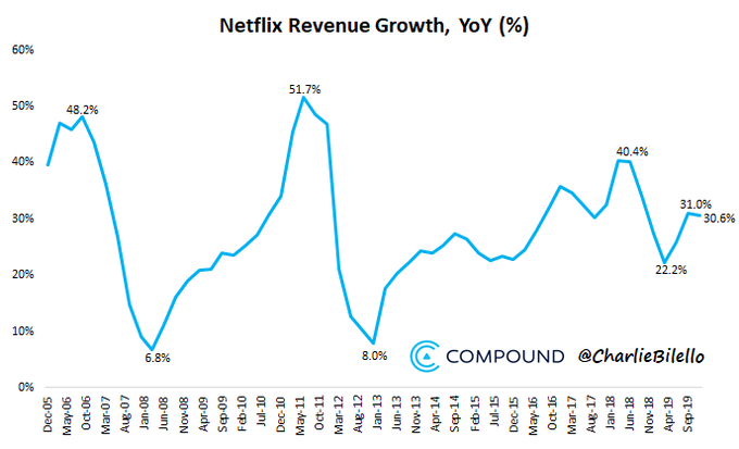 Netflix revenues were up 30.6% over the last yr, the 27th consecutive quarter of >20% YoY growth