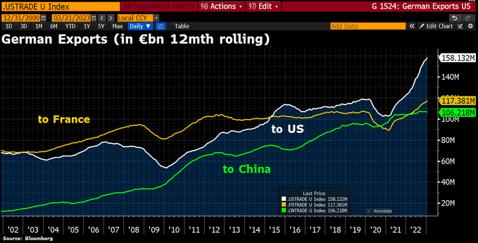 Germany Exports: China is losing importance as export destination. In Feb, exports to China slumped by 12.4%, while exports to US rose 19%. This means that US is by far the most important export market, France is also establishing itself as #2, far ahead of China
