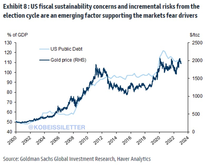Over the last 2 decades, the US Debt-to-GDP ratio and gold have been directly correlated.