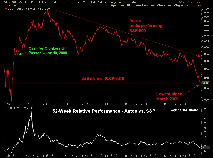 Auto stocks have underperformed the S&P 500 by over 32% in the past year, relative strength at lowest levels since March 2009