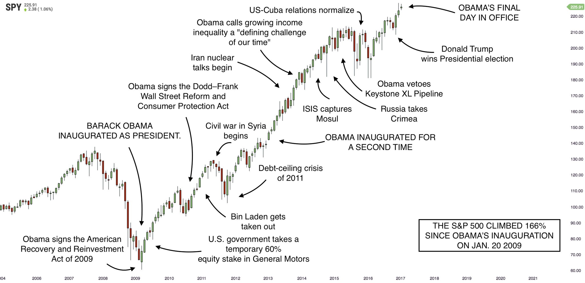 Friday was Obama's last day as US President. The S&P 500 climbed 166% since he entered the White House