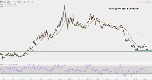 The energy sector relative to the S&P 500 is about to test its lowest levels since 2004