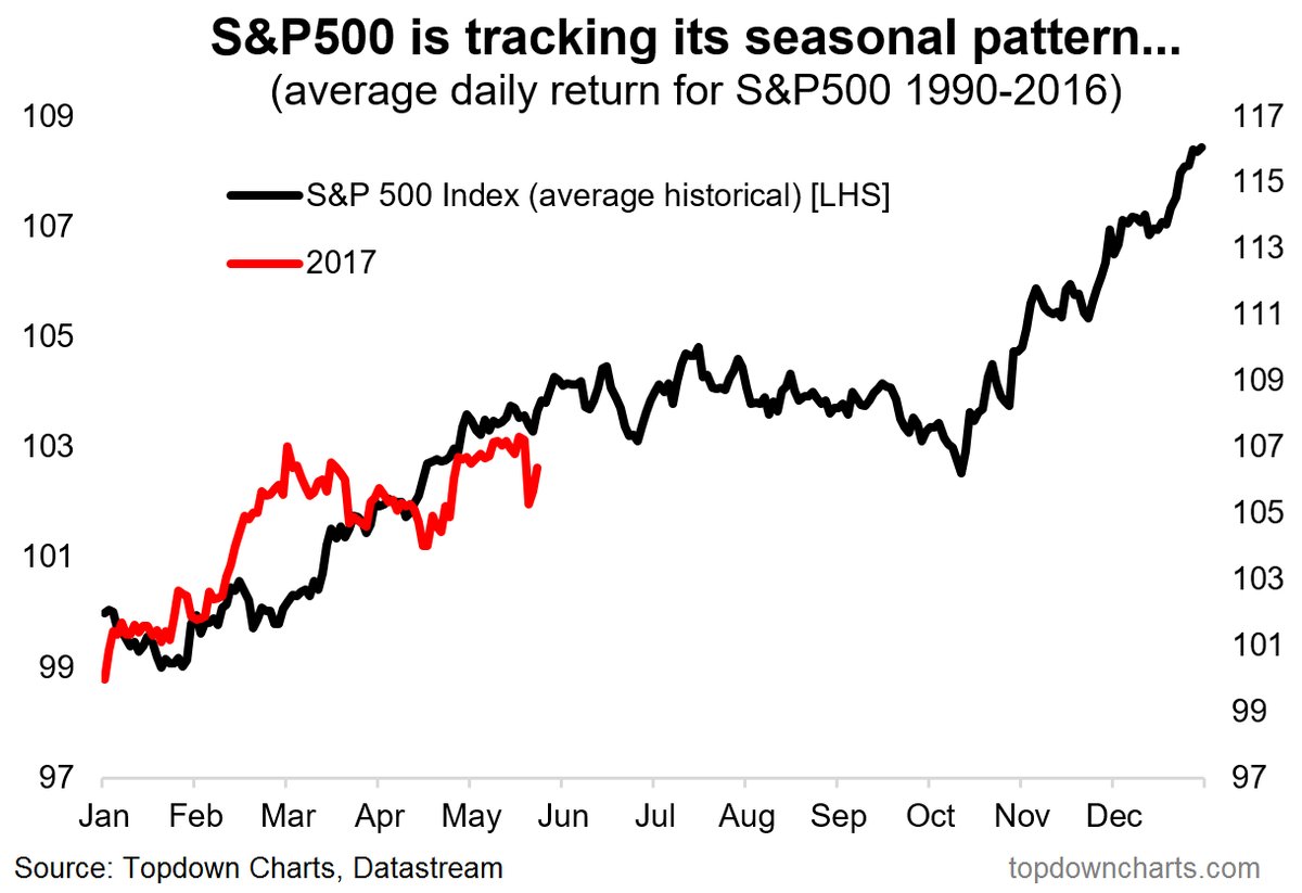 Here's the S&P 500 SPX today (red line) vs. how it's traded on average since 1990