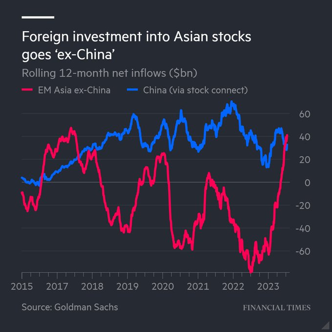 Foreign investors are shunning China for other markets in Asia, with inflows surpassing those to the world's second-largest economy for the first time in six years.