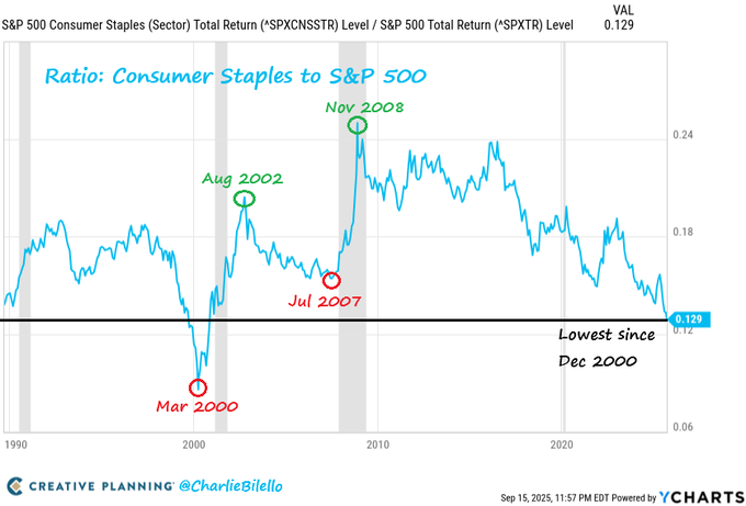 The Ratio of Consumer Staples to the S&P 500 hit its lowest level since 2000 this week.
