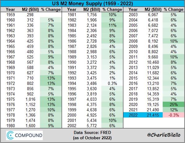 Since 1959, the US Money Supply (M2) has gone up each and every year, with the 0.3% increase in 1994 the smallest and the 25% increase in 2020 the largest