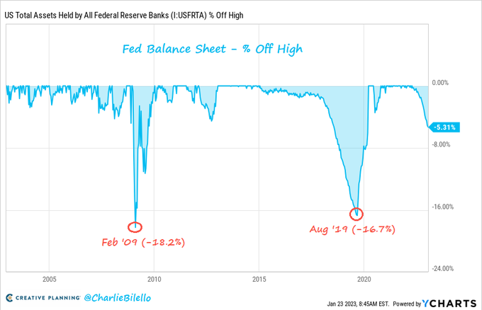 The Fed's balance sheet is now 5.3% below its April 2022 peak. The 2 largest drawdowns over the last 20 years?