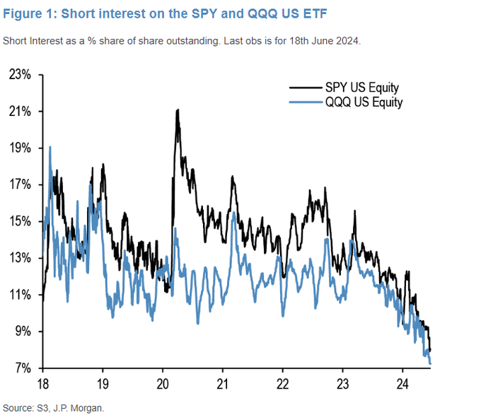 Short interest tied to SPY and QQQ is hovering at the lowest levels since at least 2018 ---JPM