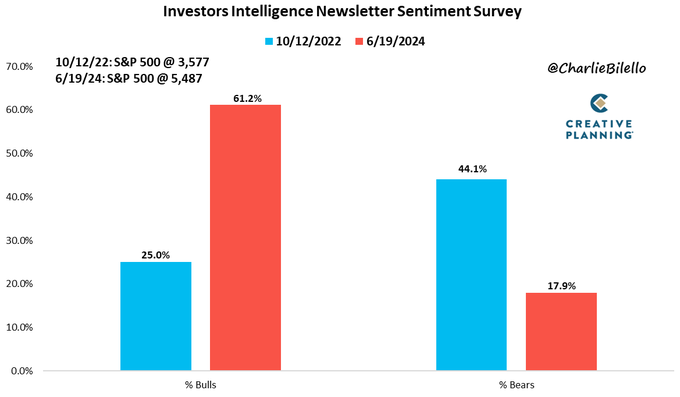 The % of Bulls in the Investors Intelligence survey has increased from 25% at the October 2022 lows to over 61% today.