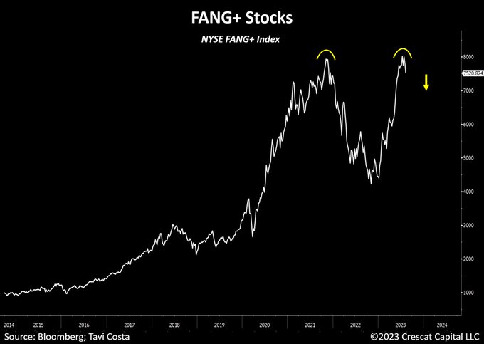 The FANG+ index almost perfectly re-tested its prior highs from late 2021, and recently formed what appears to be a double top