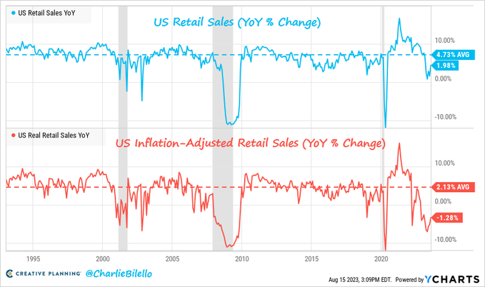After adjusting for inflation, US retail sales fell 1.3% over the last year, the 9th consecutive YoY decline. That's the longest down streak since 2009. Nominal retail sales increased 2% YoY vs. a historical average of 4.7%