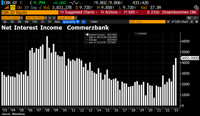 Germany: Banks are not passing on the increased interest rates to their customers. Commerzbank, Germany's 2n-largest retail bank, has announced it will increase net interest income to €8bn. Commerzbank has increased its deposit beta - a measure of how much of a rate increase it passes along to savers - slower than initially expected. The bank will end this year with something around a deposit beta of avg 40%.