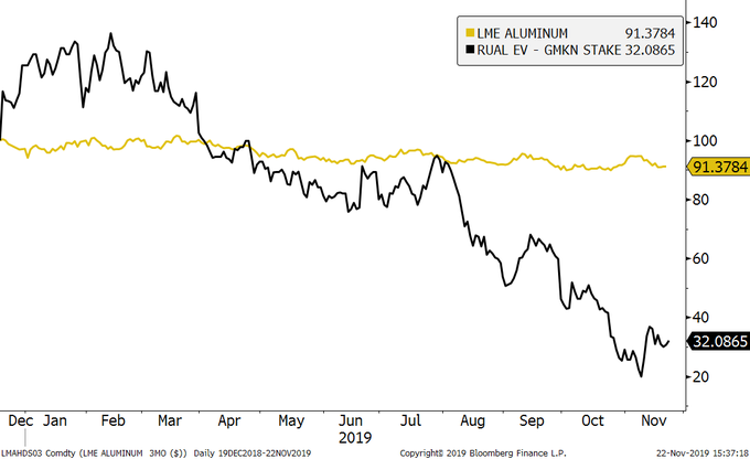 Despite bullish market in Russia, market cap of Rusal aluminum business is down 70% since sanctions lift, while the aluminum price is down only 10%.