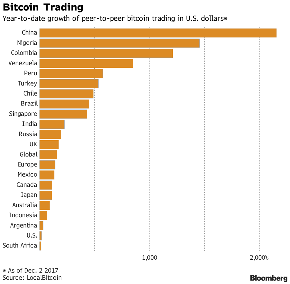 As of Dec 2017, here is the growth of peer-to-peer bitcoin trading in U.S. dollars by Country