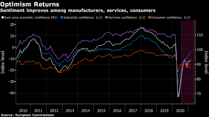 Euro-area confidence improves amid optimism on vaccine