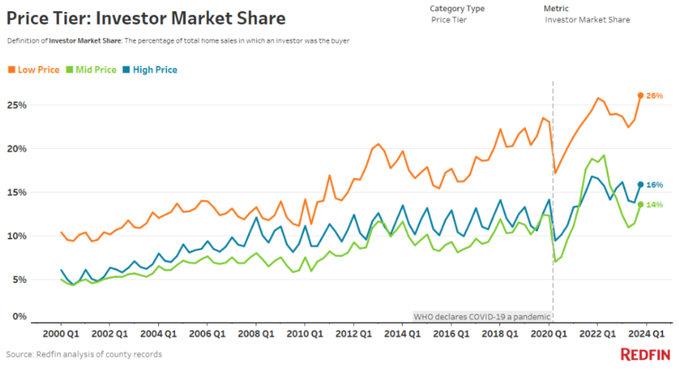 Investors bought 26% of low-priced US homes sold in the 4th quarter of 2023, the highest share on record.