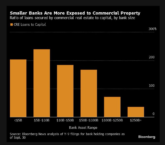 “Bloomberg’s review found 22 banks with $10 billion to $100 billion of assets hold commercial property loans three times greater than their capital. ..