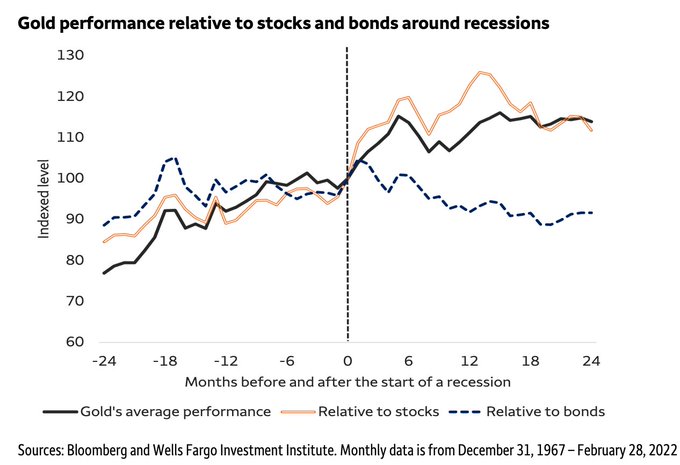 Gold tends to outperform stocks during recessions