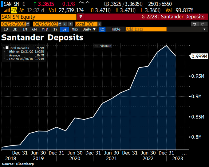 Shares of Banco Santander plunges 5% due to outflows of Spanish deposits.