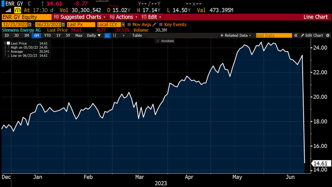 Siemens Energy shares crash 37%, the worst single-day drop ever, after the company issued a profit warning & withdrew earnings guidance, citing issues at its Gamesa wind-turbine division