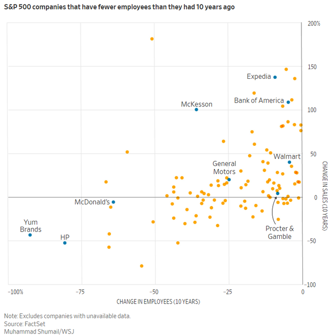 20% of companies in the S&P 500 have fewer employees today than a decade ago, including McDonald's, General Motors, Procter & Gamble, Bank of America, and Walmart