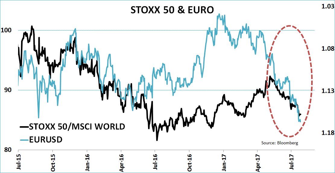 Eurozone stocks are fed up with euro strength! Down 6.5% relative to the MSCI World Index since May.