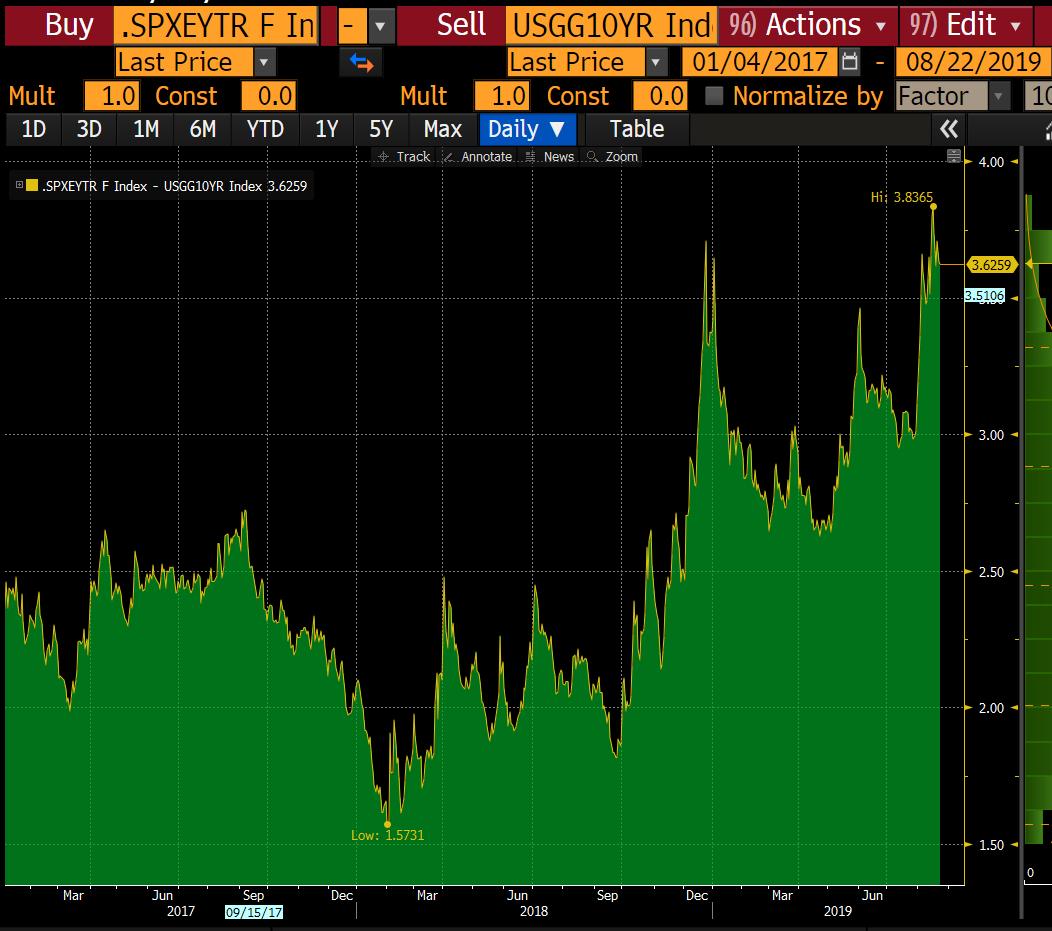 U.S. stocks are paying about the highest earnings yield relative to 10-year Treasury yields since 2016