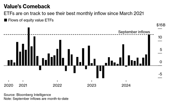 Value ETFs are seeing their largest monthly inflows since March 2021 as more market participants look for opportunities outside of high beta growth