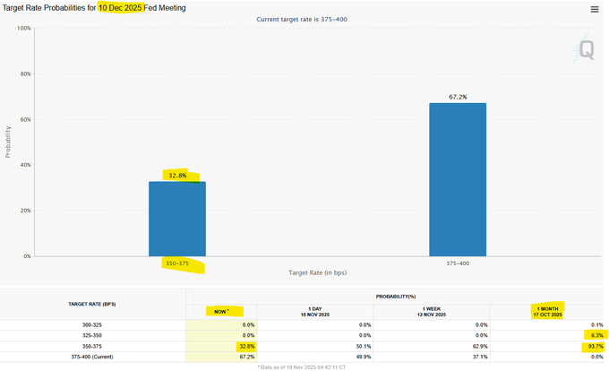 The bond market is now pricing in just a 33% chance of a Fed rate cut in December, down from 100% a month ago