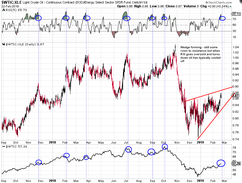 The OIL to energy stock XLE ratio suggests more correction ahead for oil