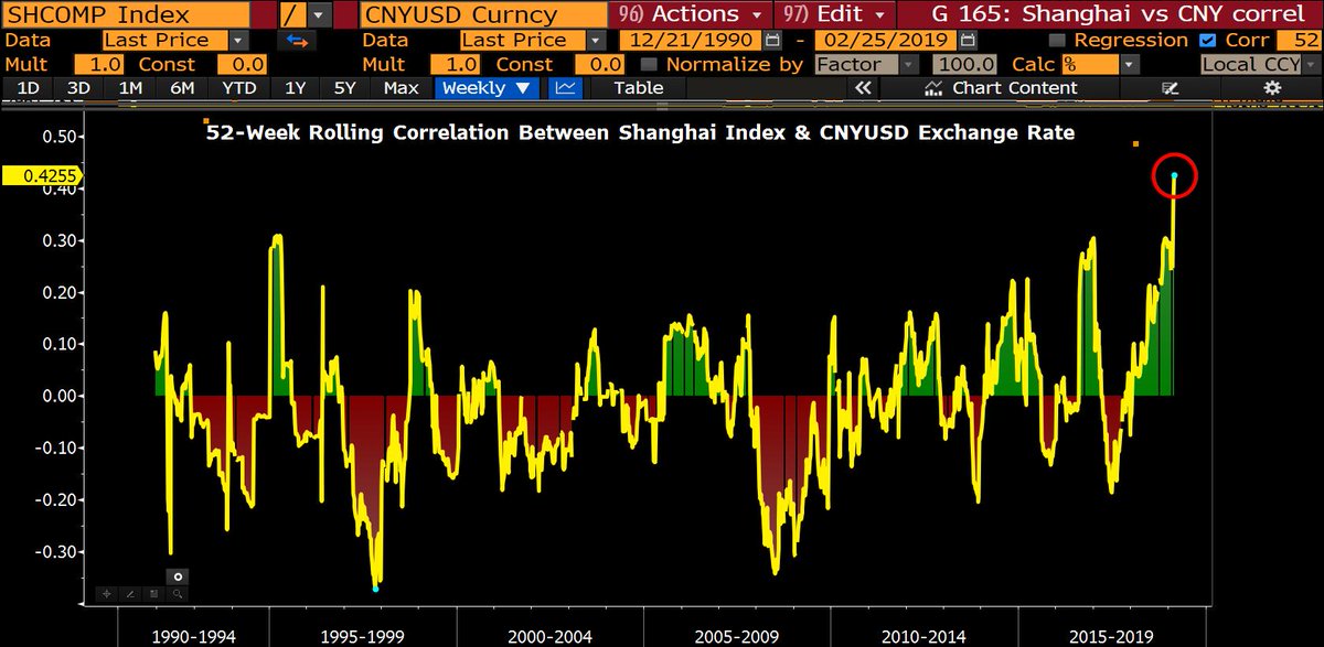 The correlation between Chinese stocks and CNY is at its highest level in history!