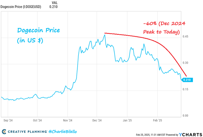 Dogecoin is now down 60% from its December 2024 high.
