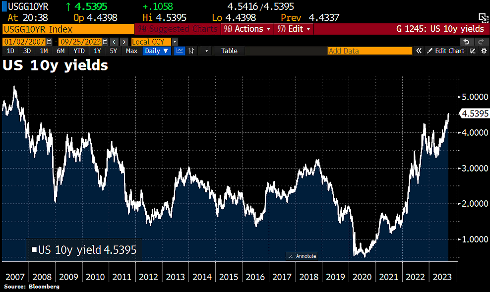 On course to 5%? US 10y yields keep rising. Now to 4.54%, the highest since 2007