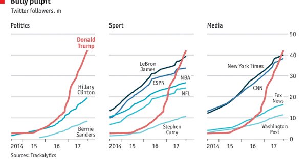 Donald Trump has 42.4m Twitter followers, making him the 21st most popular account on the platform