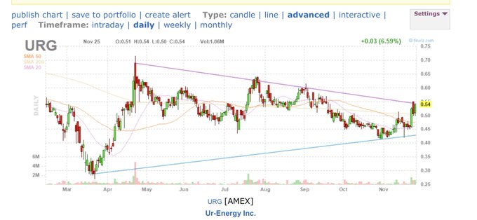 URG with uranium stocks moving, over .55 we could see a nice breakout