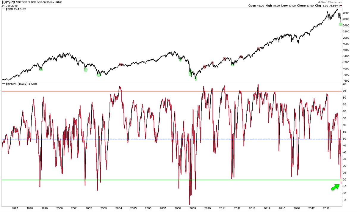 S&P 500 bullish percent index (the percentage of stocks on a P&F buy signal) has fallen to the level at the March 2009 low