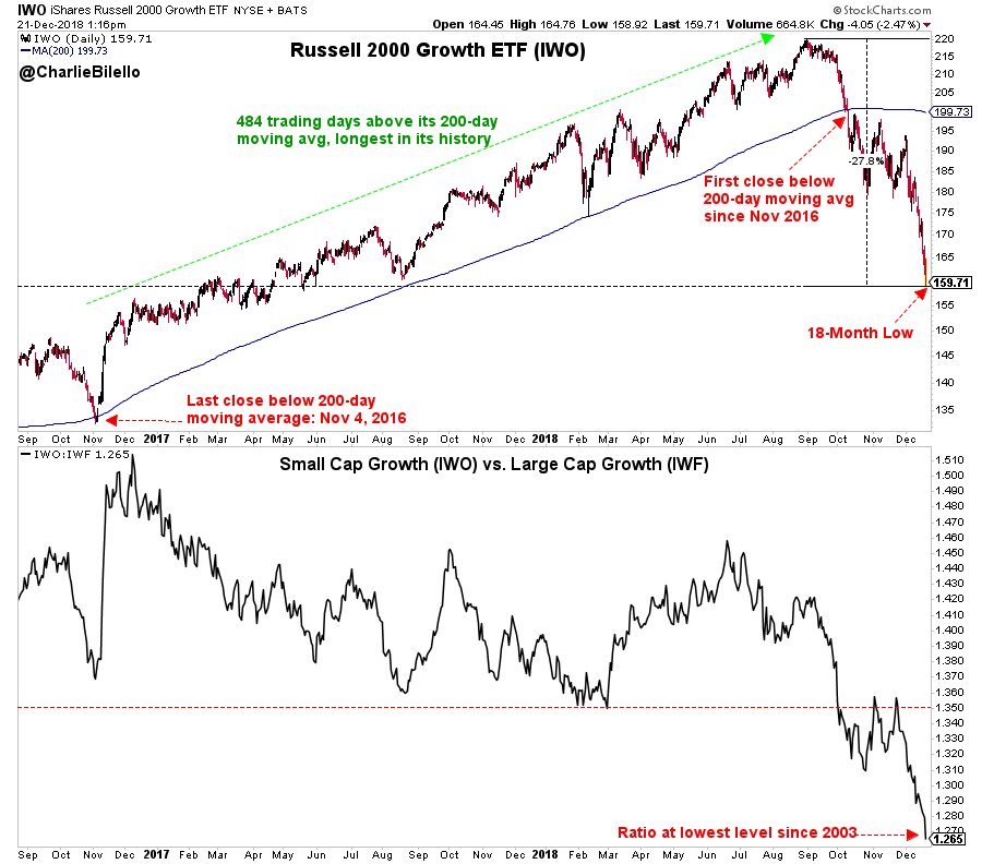Small Cap Growth Stocks hit an 18-month low, down 28% from their August high. Ratio of small cap growth to large cap growth at lowest level since 2003
