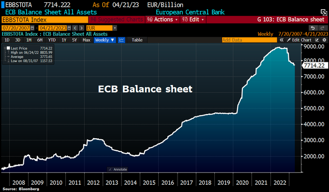 The ECB balance sheet is shrinking again. Total assets dropped €16.7bn in the past week on ECB QT. ECB balance sheet now at €7,714.2bn, equal to 58% of Eurozone GDP vs Fed's 33%, SNB's 113%, BoJ's 131%.
