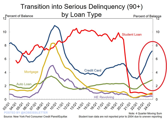 US credit card serious delinquency rates jumped to 7% in Q2 2024, the highest level since 2011