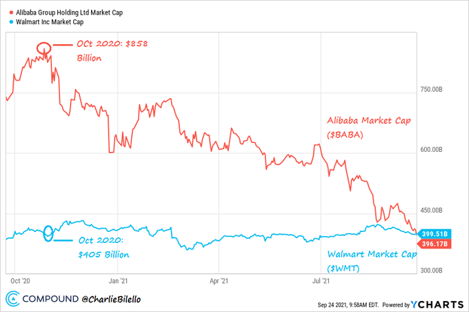 In October 2020, Alibaba's market cap was more than 2x
