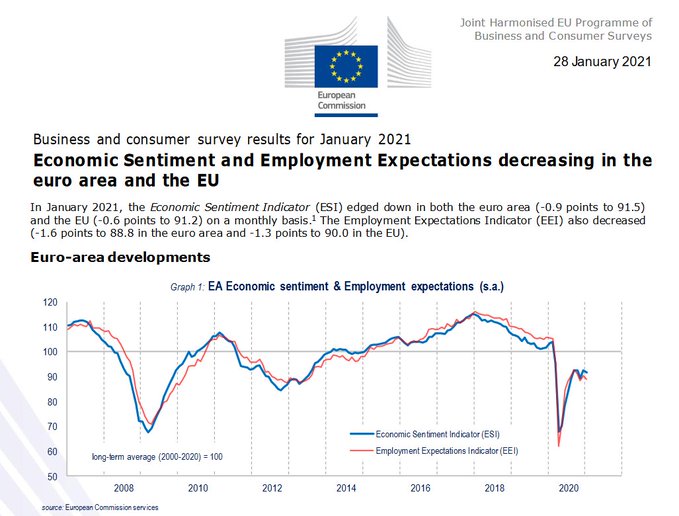 In January 2021, the Economic Sentiment Indicator edged down in both the euro area (-0.9) and the EU (-0.6) on a monthly basis.