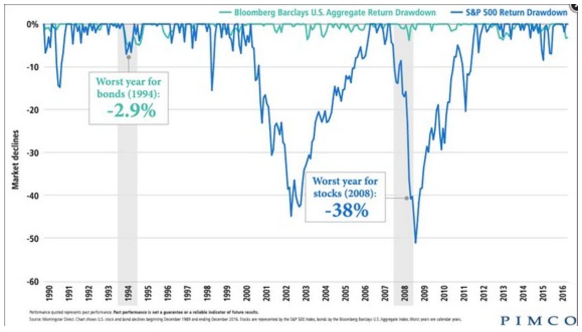 Stocks vs Bonds (bonds currently in one of worst drawdowns since 1990)