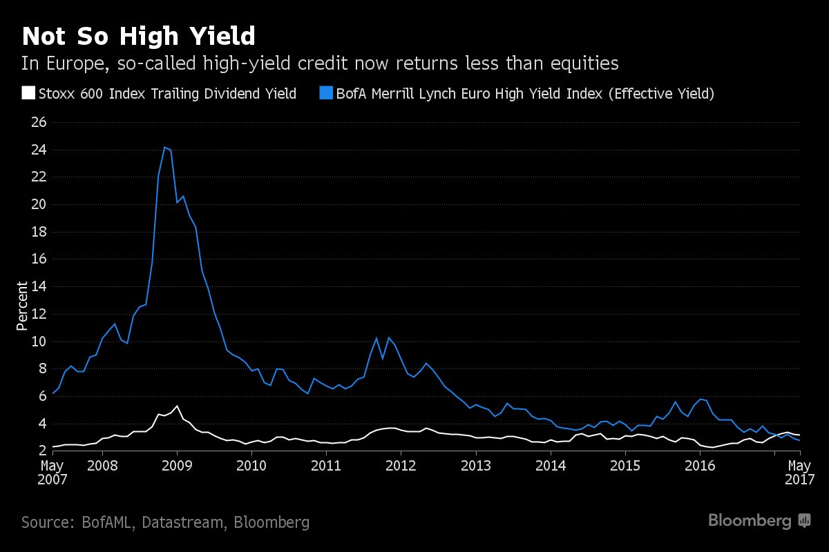Dividend yield paid by Europe's stocks surpasses junk bonds for the first time