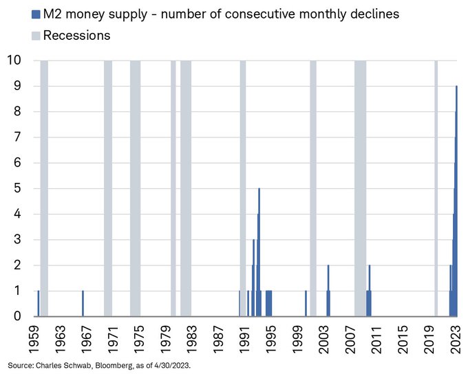 9 consecutive monthly declines in M2 money supply as of April ... definitively unprecedented streak when going back to 1950s