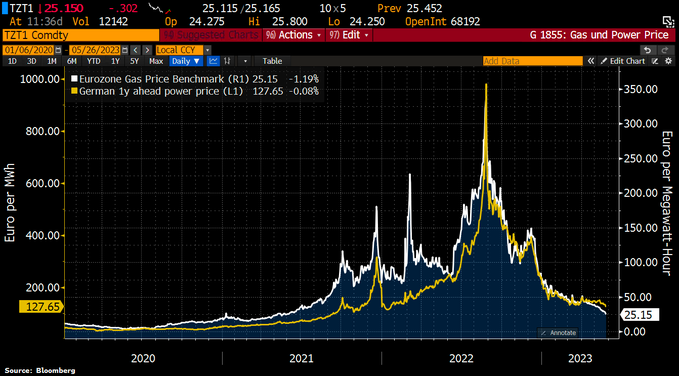 Price of EU Natural Gas has hit 2y low, in contrast to German electricity price, which remains considerably higher