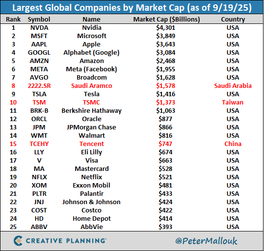 The world’s 7 largest companies are all U.S. tech giants — together worth over $20 trillion. And 22 of the top 25 are American.