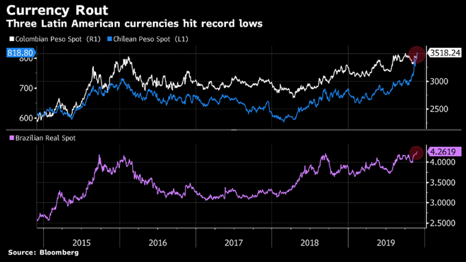 Latin American markets are experiencing a rout as anti-government protests spread. Brazil, Chile and Colombia's currencies have all weakened to record lows